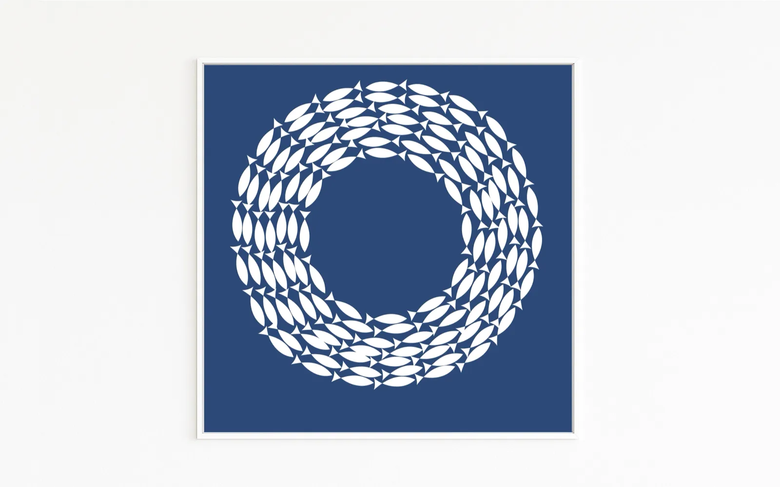 SWARM presents a stylized school of fish forming a perfect circle — a symbol of unity, movement, and the balance of nature. The white silhouettes set against deep blue create a strong graphic presence, reminiscent of mandalas or the cyclical nature of life. Calm and motion come together in a timeless, meditative image. SWARM is part of the Blue In A Square art series featuring 250+ artworks.